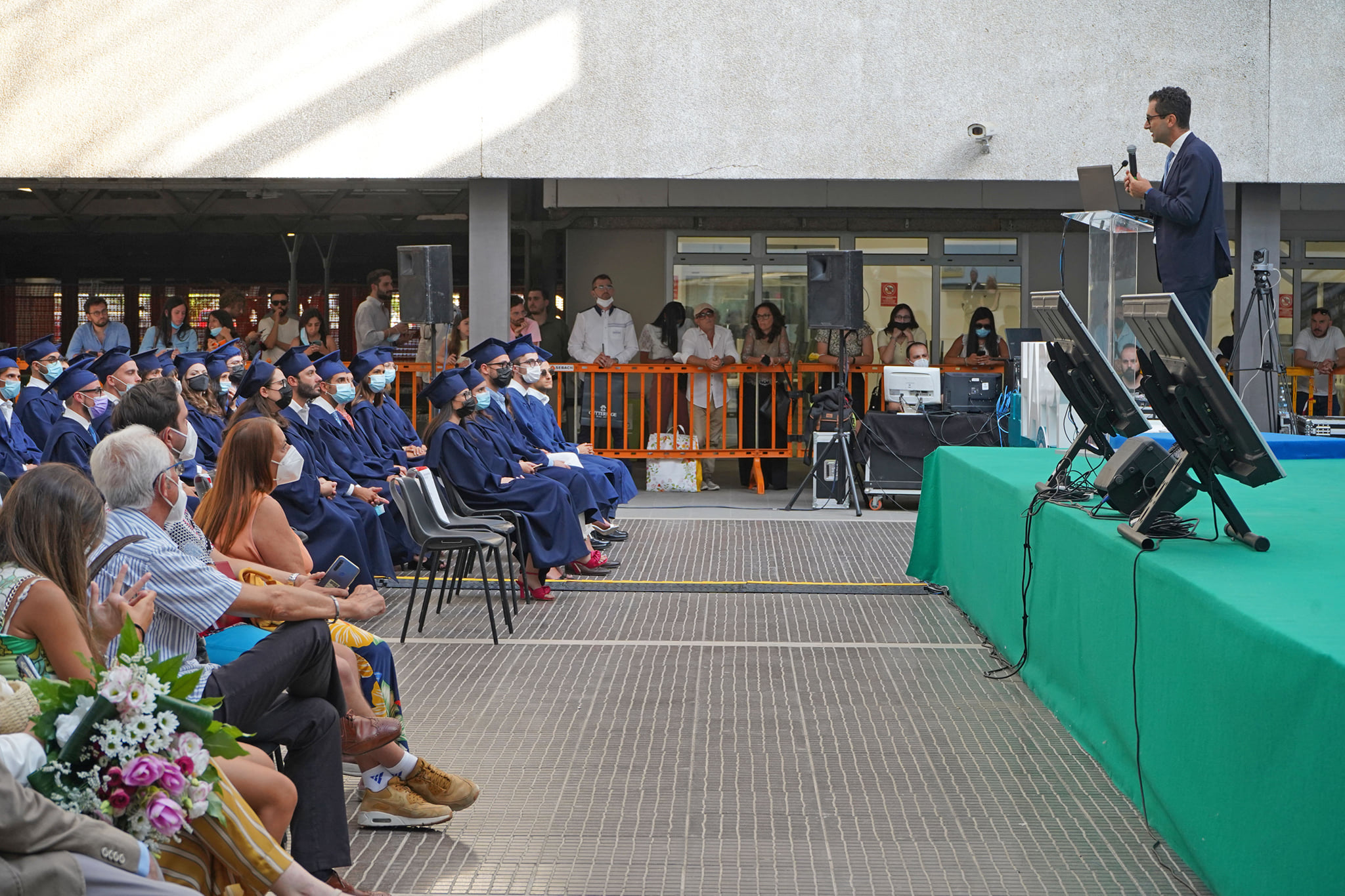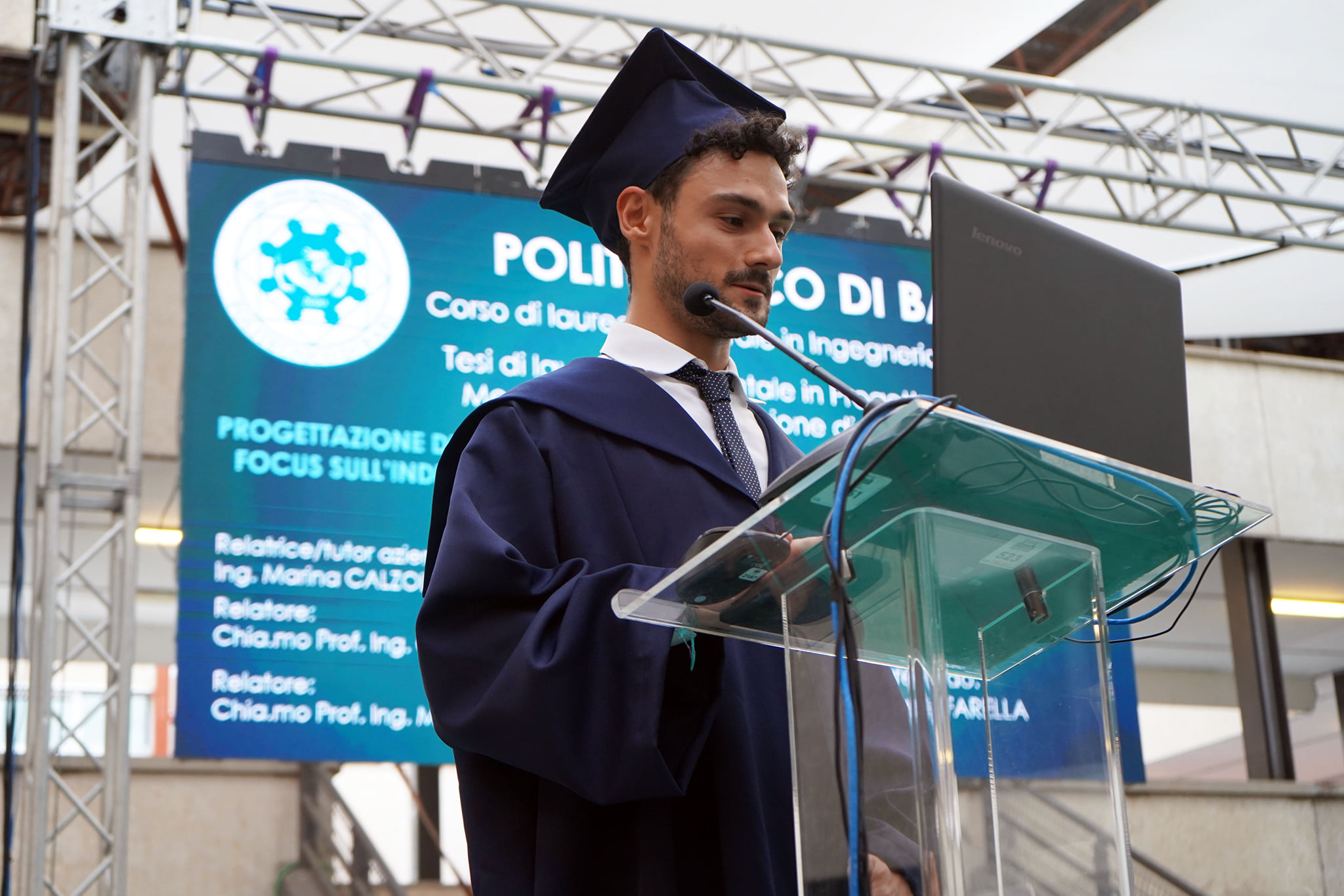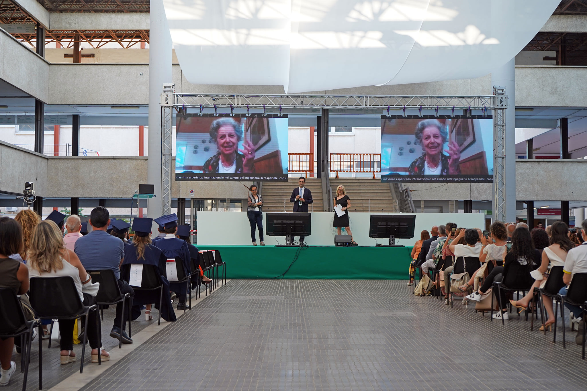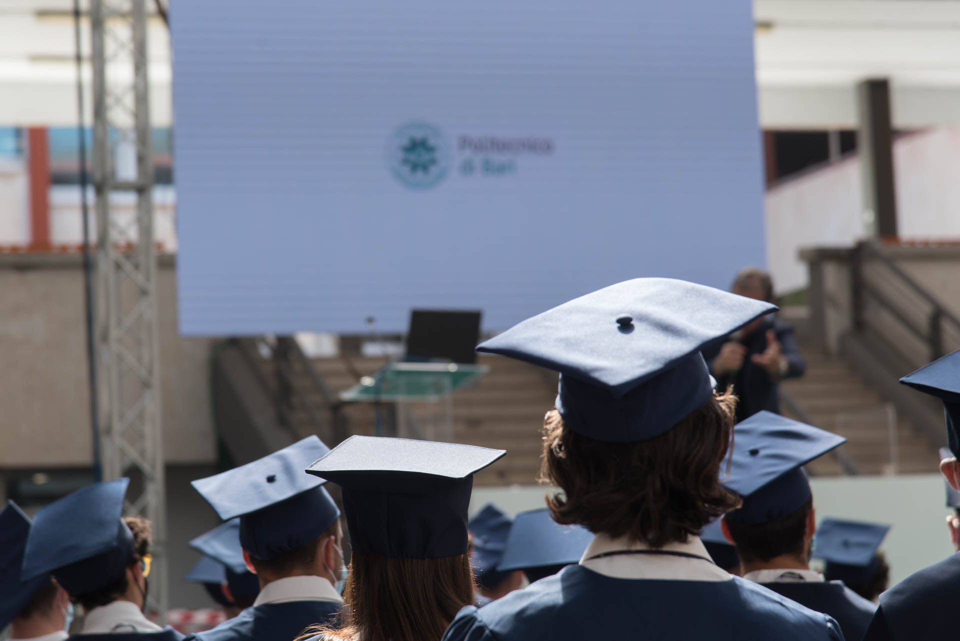 I laureandi hanno discusso le proprie tesi nell’atrio coperto “Cherubini”, su un palco attrezzato con maxischermo per la proiezione delle slide e sul quale hanno preso posto anche le commissioni. La stessa organizzazione ha caratterizzato i Graduation Days del 12, 13, 15 e 16 luglio scorsi, quattro giornate dedicate alla consegna delle pergamene ai ragazzi che si sono laureati da remoto, in videocollegamento, durante il periodo di zona rossa e delle restrizioni agli eventi in presenza.