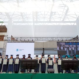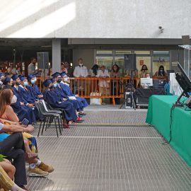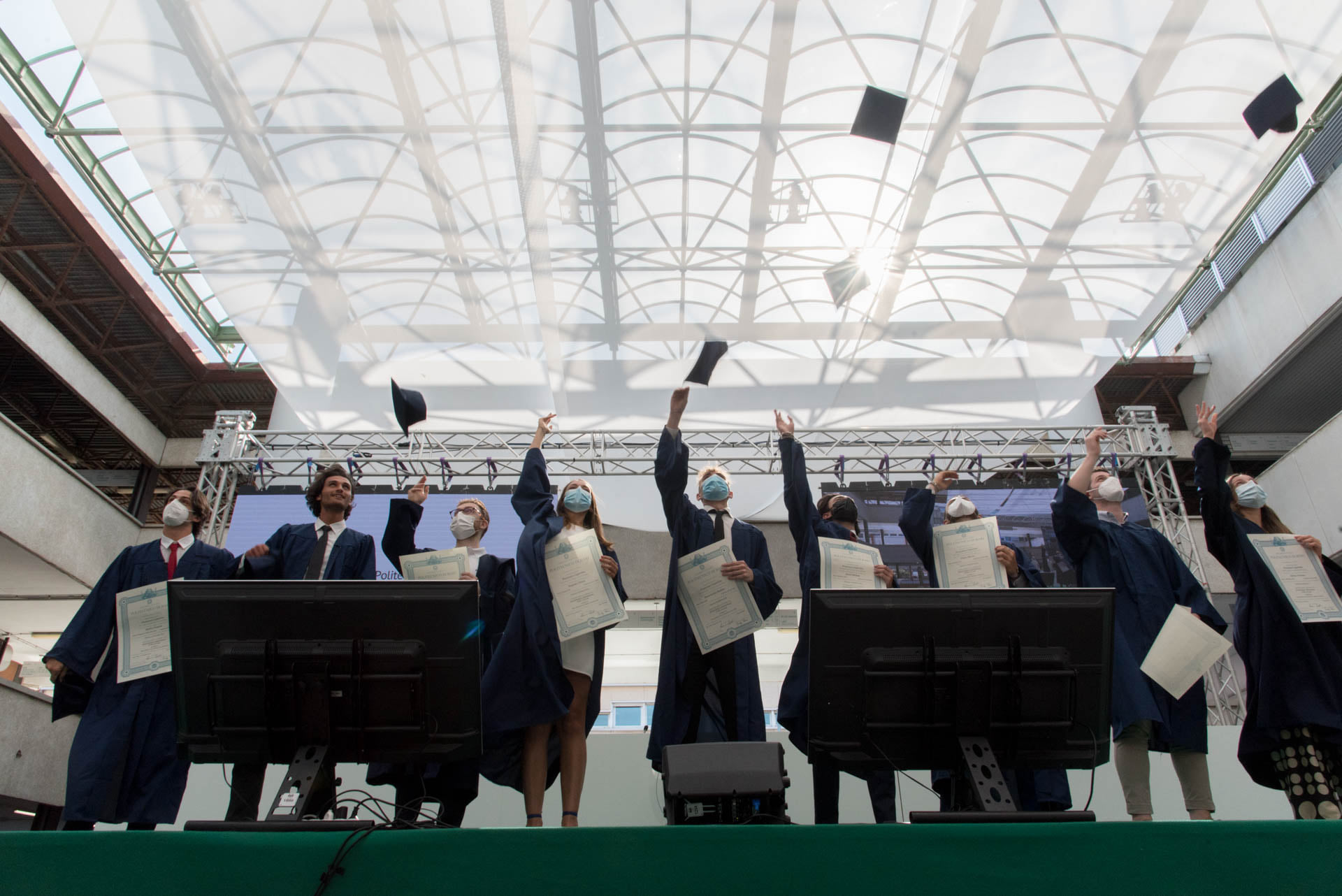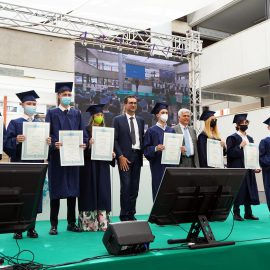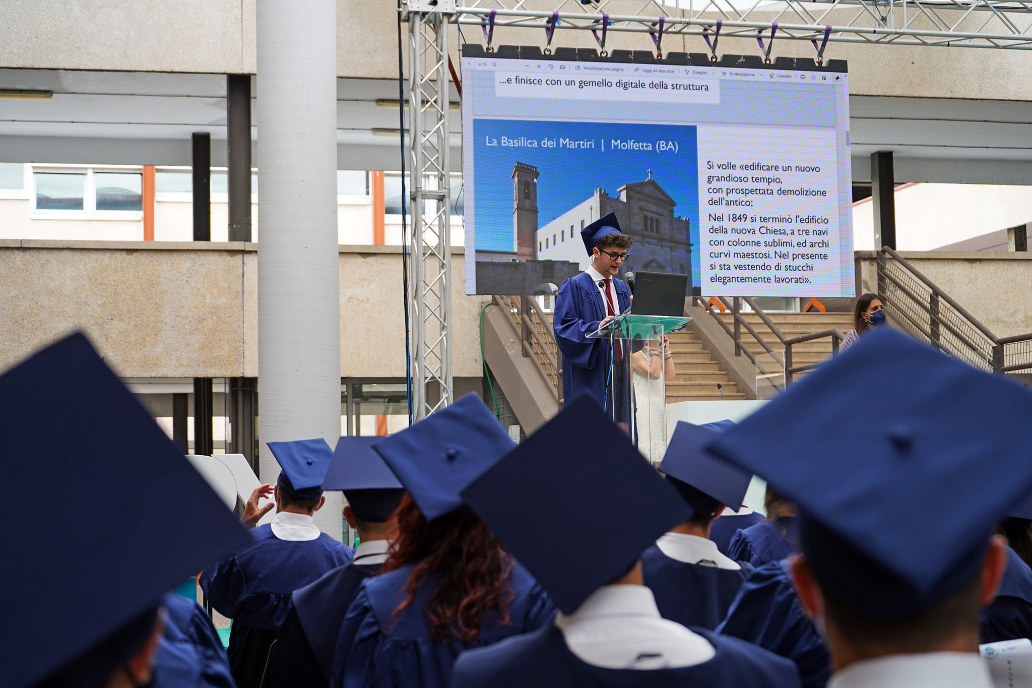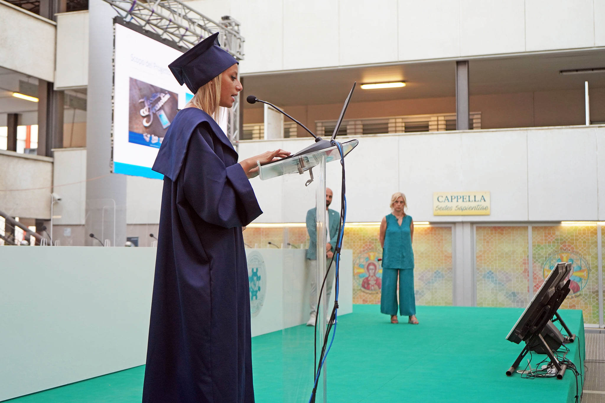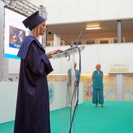 I laureandi hanno discusso le proprie tesi nell’atrio coperto “Cherubini”, su un palco attrezzato con maxischermo per la proiezione delle slide e sul quale hanno preso posto anche le commissioni. La stessa organizzazione ha caratterizzato i Graduation Days del 12, 13, 15 e 16 luglio scorsi, quattro giornate dedicate alla consegna delle pergamene ai ragazzi che si sono laureati da remoto, in videocollegamento, durante il periodo di zona rossa e delle restrizioni agli eventi in presenza.