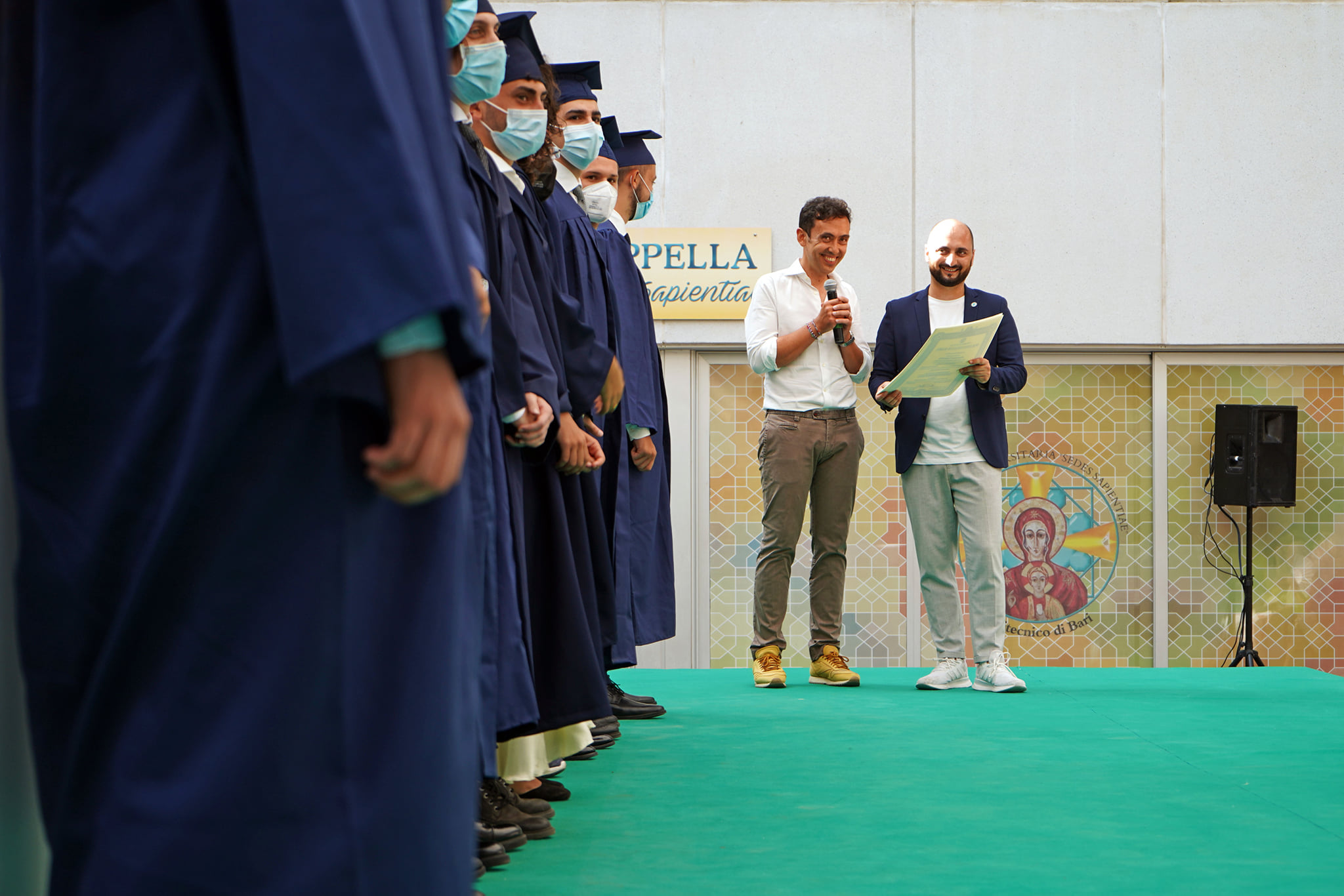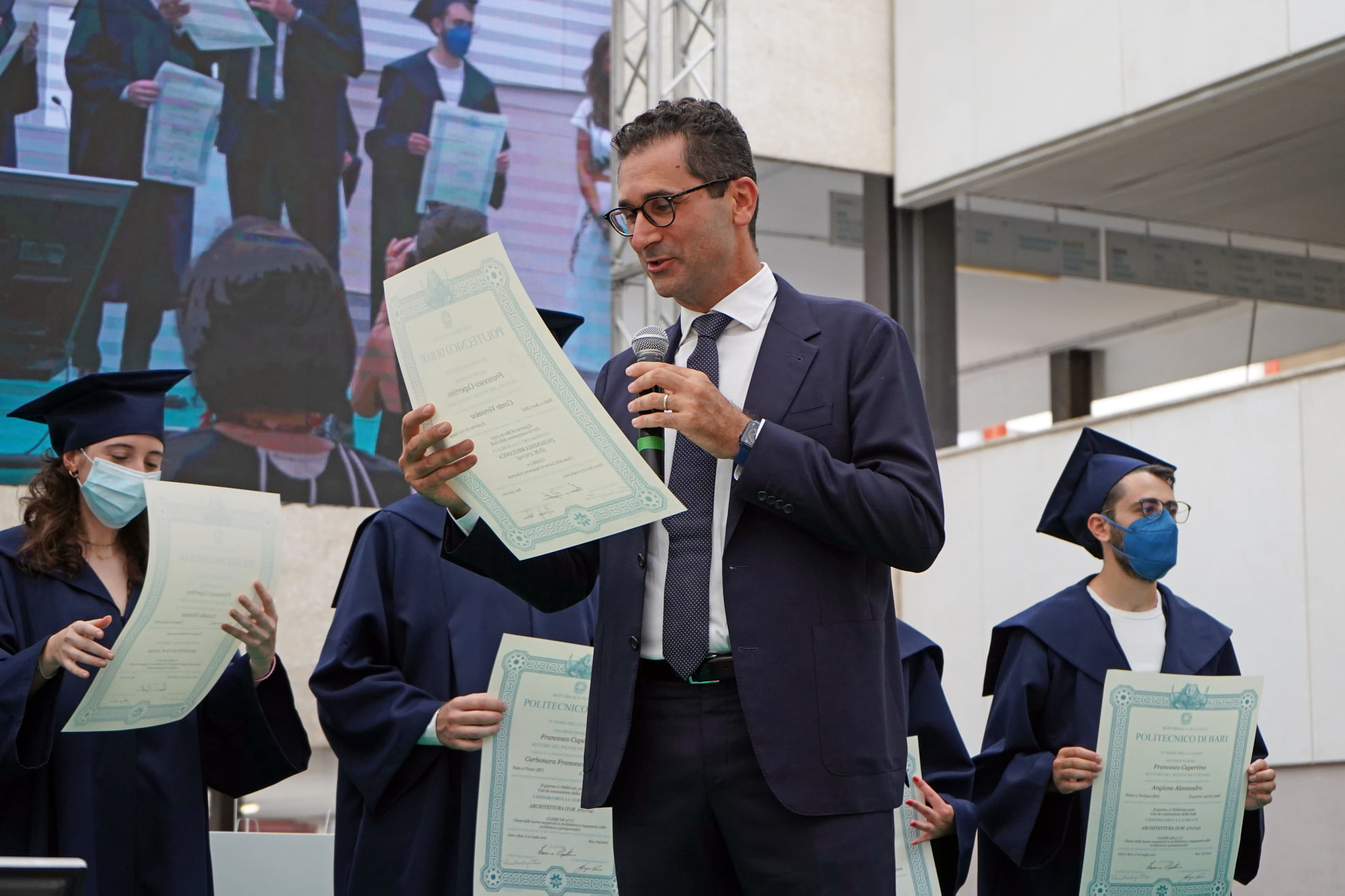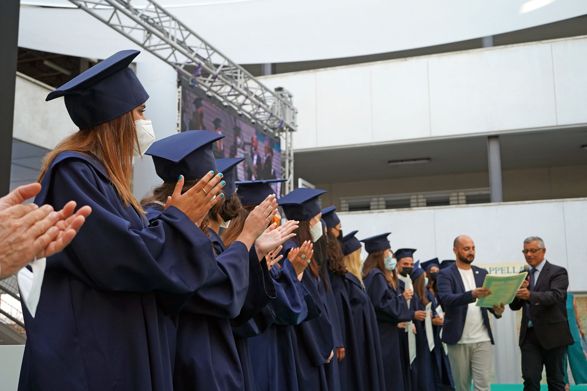 Una maratona organizzativa, dunque, fortemente voluta dall’ateneo pur nel rigido rispetto delle misure di sicurezza sanitaria, per ricompattare la comunità dopo i lunghi mesi di pandemia e guardare alla ripartenza di tutte le attività, il prossimo autunno. La cerimonia, infatti, si è svolta nel rispetto di un protocollo che ha caratterizzato, in questo periodo estivo, tutte le sedute dal vivo: accesso dei candidati, accompagnati ognuno da un massimo di quattro persone, attraverso check point con controllo della temperatura corporea e consegna di autocertificazione; assegnazione nominativa e con distanziamento dei posti a sedere; mascherine per tutti.
