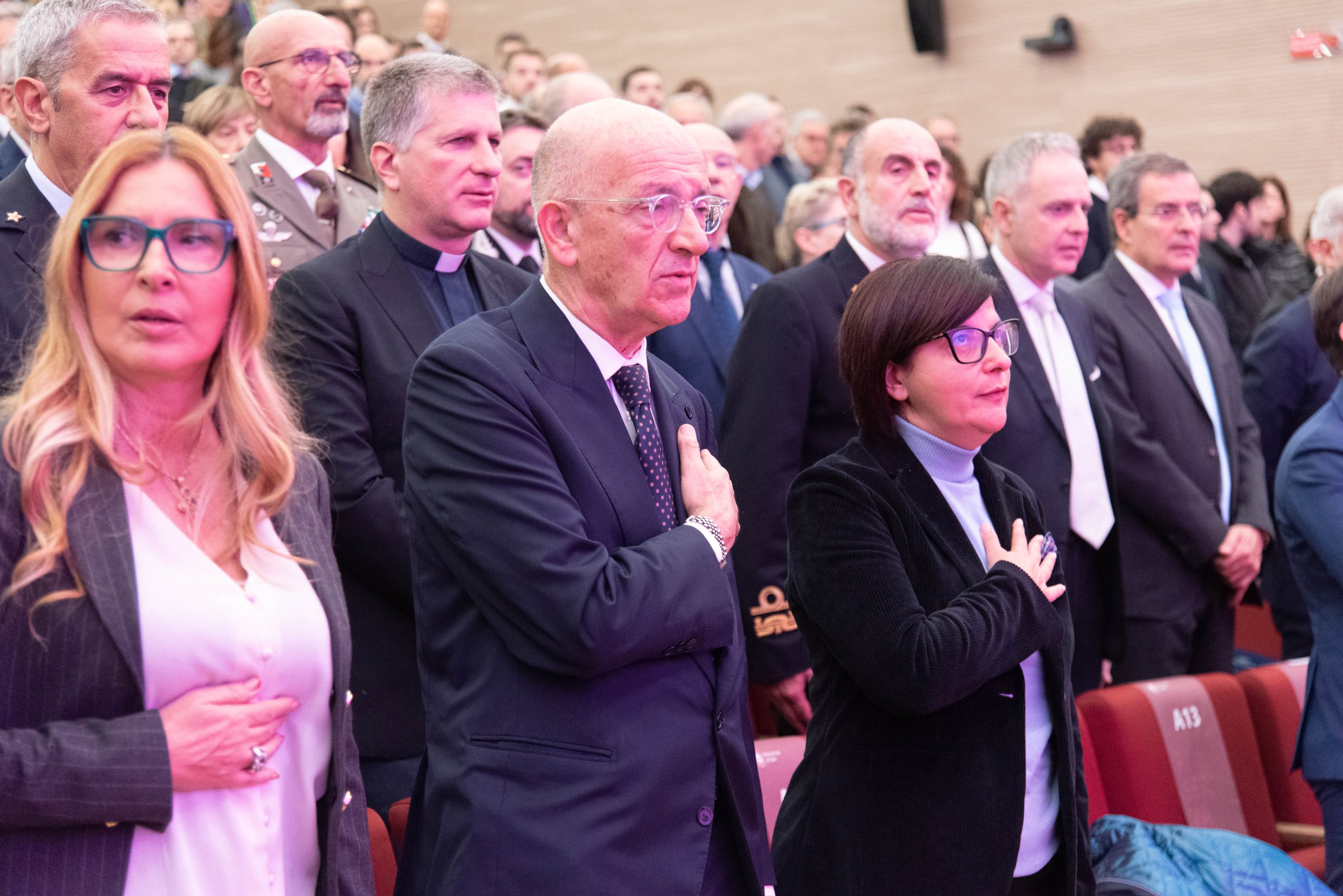 Il momento dell'inno nazionale. Al centro, il viceministro Francesco Paolo Sisto