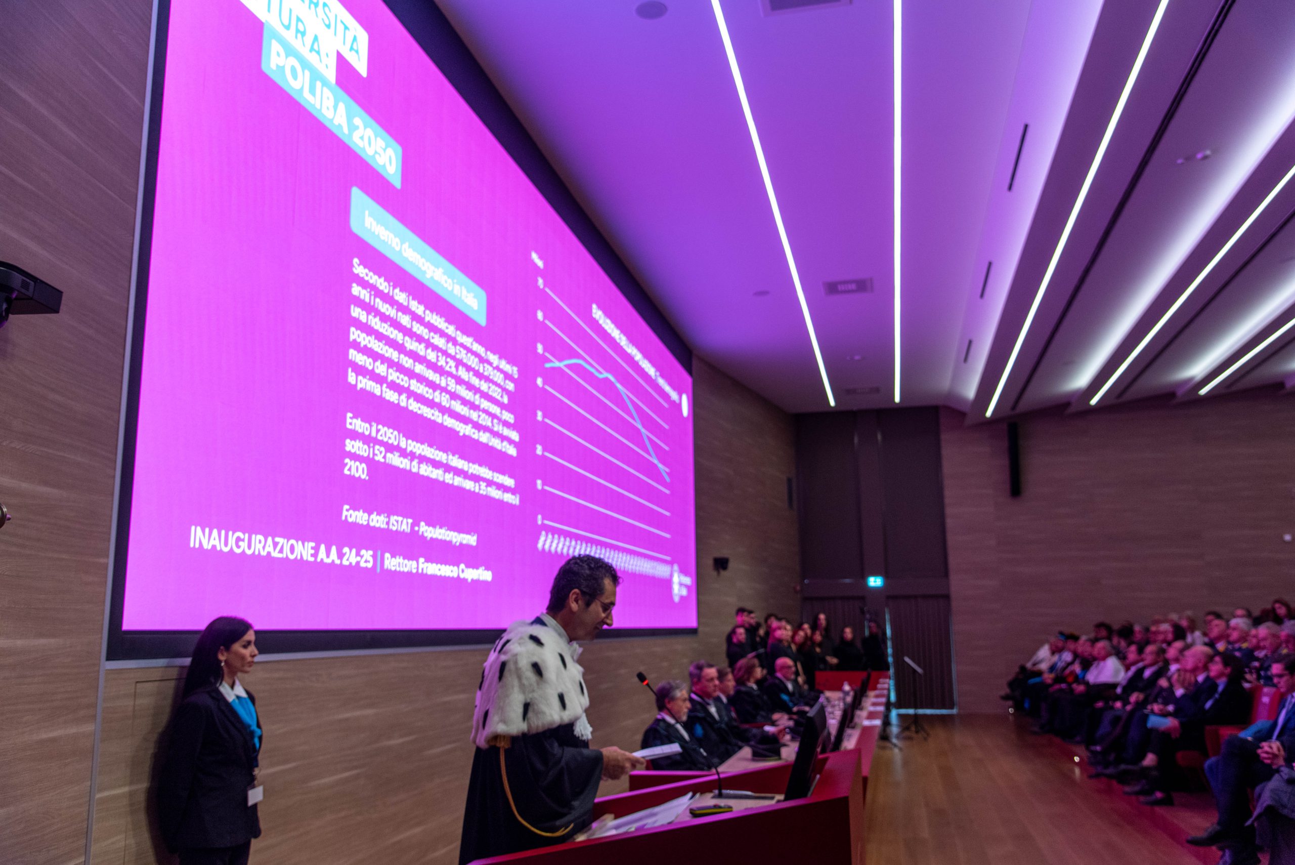 Sul piano dell’offerta formativa, nel 2024/2025 il Politecnico ha avviato un corso di laurea in “Ingegneria della Creatività Digitale”, per formare professionisti del design di prodotti digitali e lo sviluppo di contenuti multimediali. Per il 2025/2026, intanto, si sta lavorando a progetti internazionali, come il corso in “Scienze dell’architettura per il patrimonio”, in collaborazione con l’Università di Valona, in Albania. «Il futuro – ha detto il rettore Cupertino in chiusura del suo discorso – è qui».